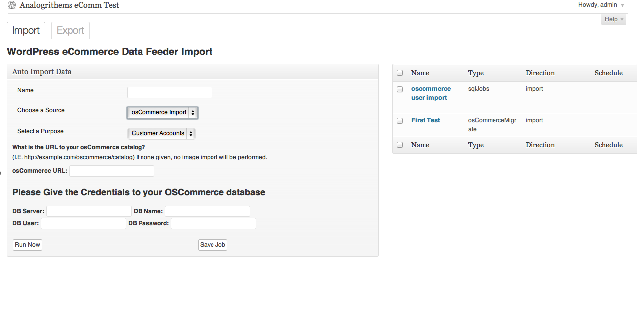 You’ll notice you have two options after you’ve filled out the form.  Save Job and Run Job If you click save all your settings will be remembered and you can access via the right menu at any time.   If you click run, then sit back because this processes as I stated before can take a while.  When it completes it will tell you how many products/variants or customers accounts where imported or updated.  You have to make sure though that when it’s running you don’t interrupt it.