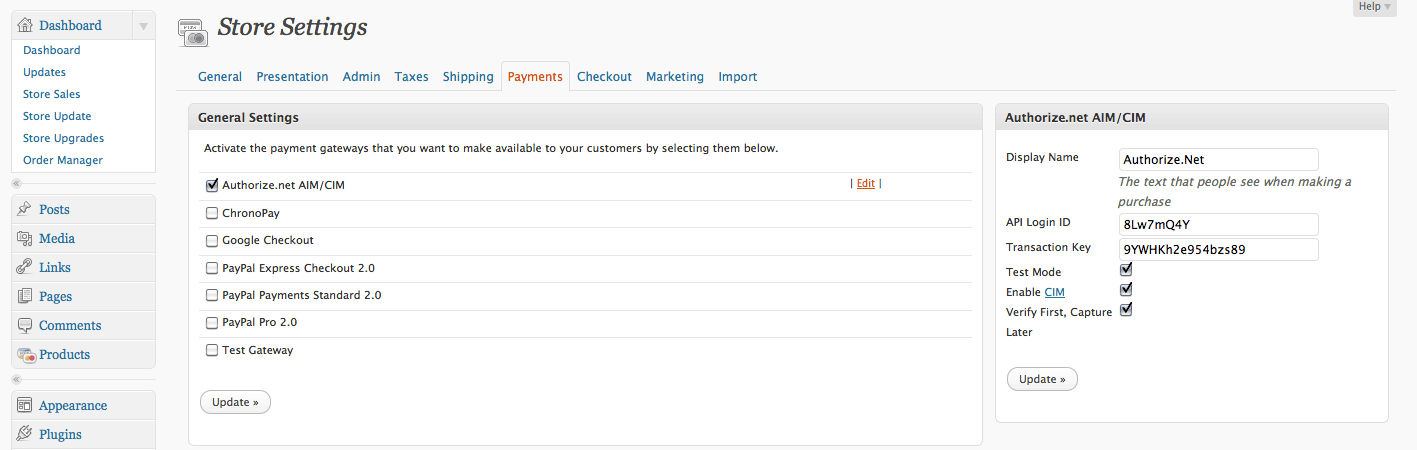 Setup and configuration for this plugin is very simple. After you do the standard wordpress setup of copying the wpec-authorize.net plugin to the wordpress/wp-content/plugins directory you just go to the plugins panel and activate. Now all you have to do is configure this plugin under the WordPress Ecommerce Store Settings in the admin panel.
