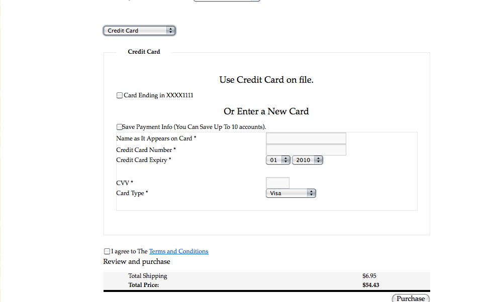 As you can see this module supports two of the authorize.net librarys the AIM & CIM (see http://developer.authorize.net/api/). In this first screen show you see the checkout processes where they user has selected to use credit card and can now choose to use a card he already has on file much like paypal. He also has the option to input a new card. With the newly entered card the user also has the choice to save this card for easier checkout next time he buys something. Note to wpec admins, the card will only be saved if it successfully authenticates on checkout.